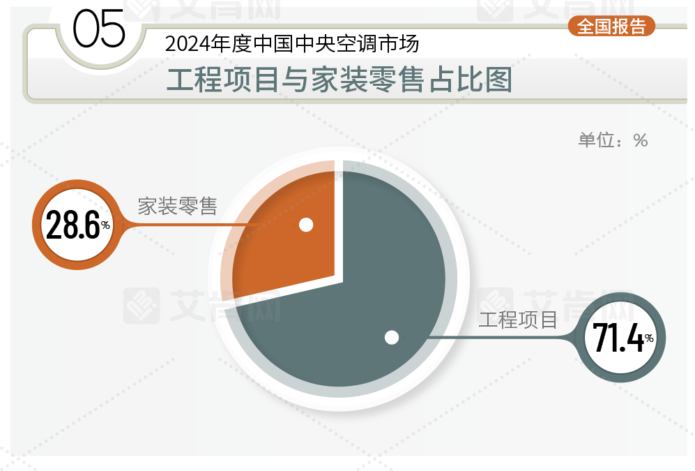 2024年度,工程項目市場的各個細分板塊的市場表現大多呈現下滑態勢。其中,下滑幅度最大的當屬精裝修樓盤配套市場。根據中指研究院披露,2024年1-12月,TOP100房企銷售總額為43547.3億元,同比下滑30.6%,精裝修樓盤開盤數量下降明顯,精裝率也同比下降。受此影響,精裝修樓盤配套市場需求疲軟,與之相配套的多聯機組、單元機組等產品也成為2024年度下滑幅度較大的產品。但是需要指出的是,定位高端的精裝修樓盤配套項目在2024年度受到的影響并不大,表現仍然較為平穩。