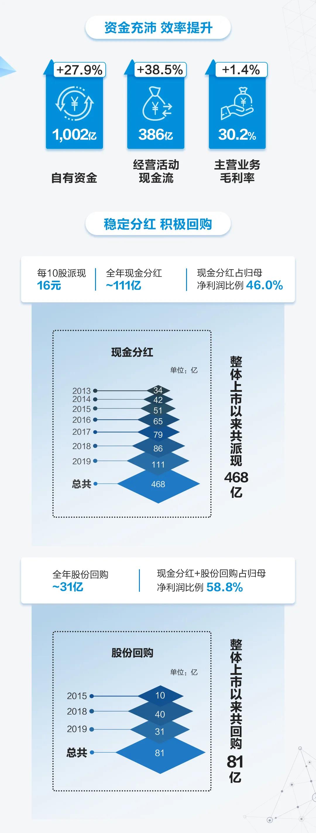 同時,2019年內,美的集團自有資金達到了1002億元,同比增幅高達27.9%,主營業務毛利率為30.2%,相比于上一個報告期增長了1.4個百分點,這兩組數據也表明,美的集團的經營質量同樣得到了再次提升。