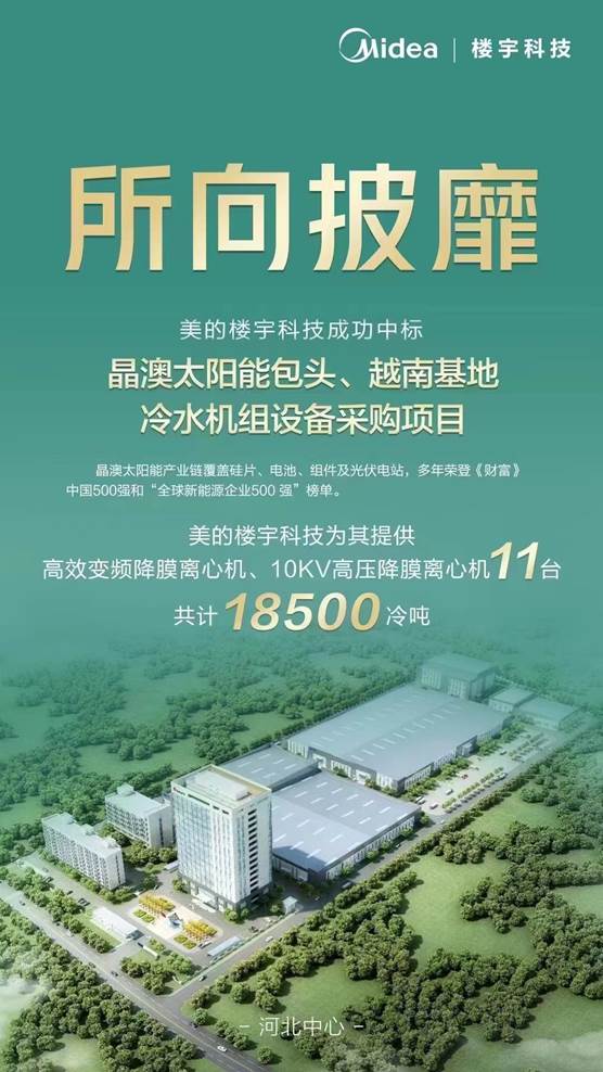 從美的樓宇科技河北中心獲悉,美的樓宇科技成功中標晶澳太陽能包頭、越南基地冷水機組設備采購項目,為其提供高效變頻降膜離心機、11臺10KV高壓降膜離心機,共計18500冷噸。