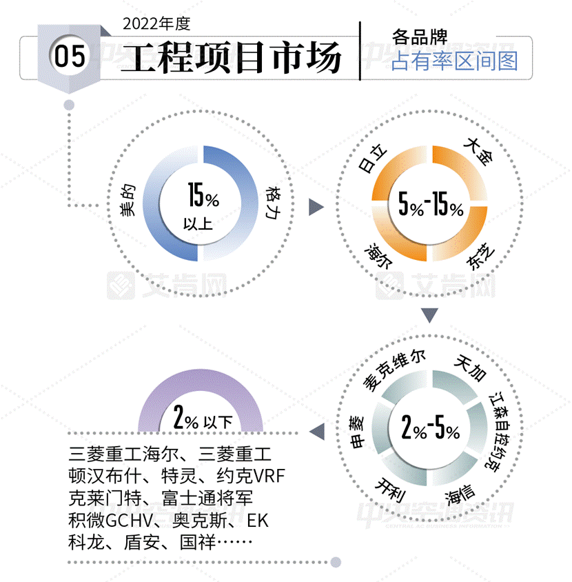 近日,艾肯網(wǎng)發(fā)布的《2022年度中國(guó)中央空調(diào)市場(chǎng)報(bào)告》,將全國(guó)市場(chǎng)分為工程項(xiàng)目市場(chǎng)和家裝零售市場(chǎng)兩個(gè)市場(chǎng)分別進(jìn)行總結(jié)和分析。其中,在工程項(xiàng)目市場(chǎng)中,美的憑借超過15%的市場(chǎng)占有率,再次成為工程項(xiàng)目市場(chǎng)的第一名。