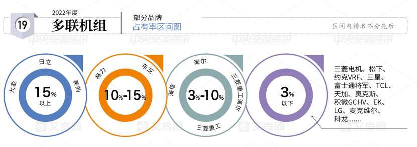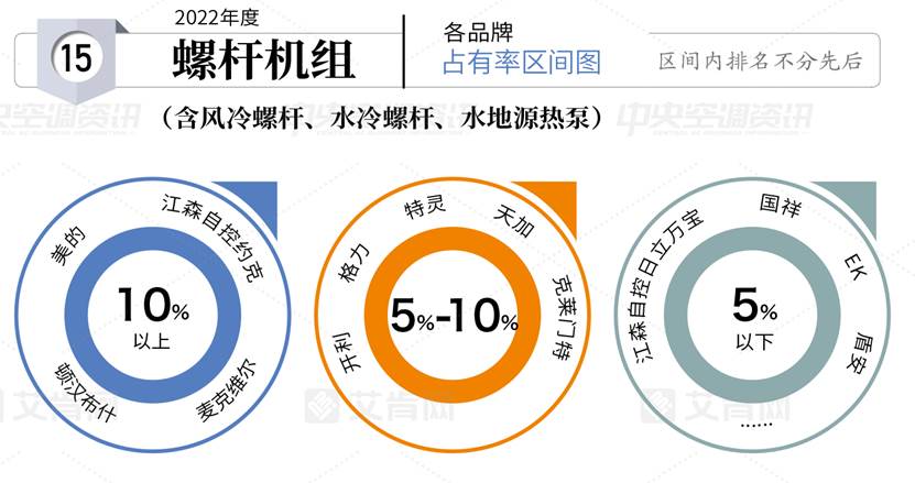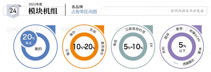 在離心機(jī)組市場(chǎng),美的以超過10%的市場(chǎng)占有率位列第一檔;在螺桿機(jī)組市場(chǎng),美的同樣以超過10%的市場(chǎng)占有率位列第一檔;在多聯(lián)機(jī)組市場(chǎng),美的市場(chǎng)占有率超過15%,與大金、日立并列第一檔;在模塊機(jī)組市場(chǎng),美的以超過20%的市場(chǎng)占有率成為模塊機(jī)組市場(chǎng)的第一。
