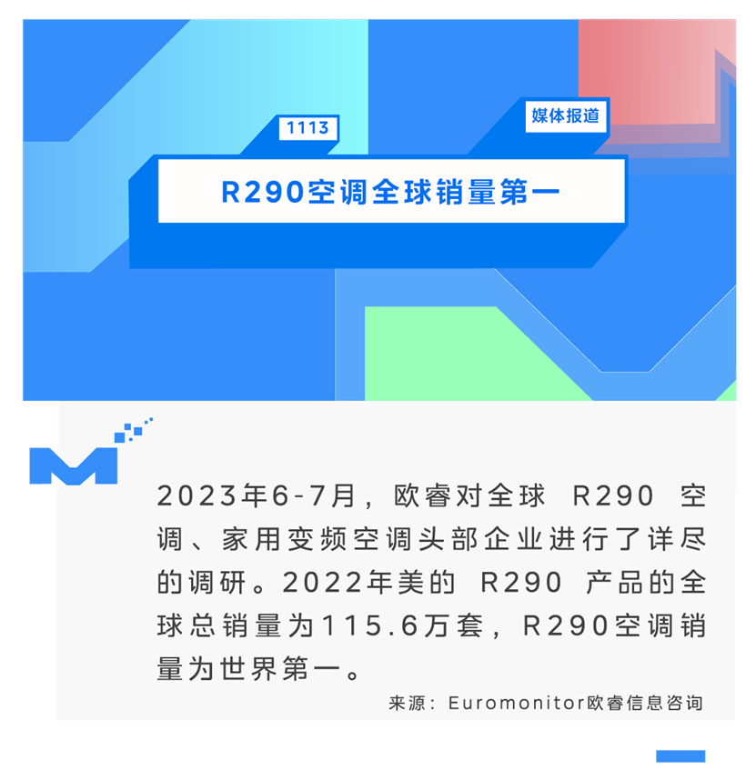 2023年6-7月,歐睿對全球 R290 空調、家用變頻空調頭部企業進行了詳盡的調研。在本次研究中,歐睿邀請了來自全球主要空調企業,包括已推出 R290 空調及對 R290 HVAC 賽道持續關注的行業專家,對全球空調制冷劑的演變及 R290 空調的產業化應用進行了深入探討,確定了中國頭部家電企業在 R290 技術及產品市場化上的資源投入,并統計2022年美的推出的 R290 產品包括除濕機、移動式空調和分體式空調的銷量,2022年美的 R290 產品的全球總銷量為115.6萬套,R290空調銷量為世界第一。根據美的統計,2018-2023年4月,美的 R290 產品的累計銷量約620余萬套,相對于 R134a、R410A 等產品,R290 冷媒的替換實現了溫室氣體減排371.5萬tCO?e(噸二氧化碳當量),相當于440萬公頃亞馬遜熱帶雨林一年的CO?吸收量。