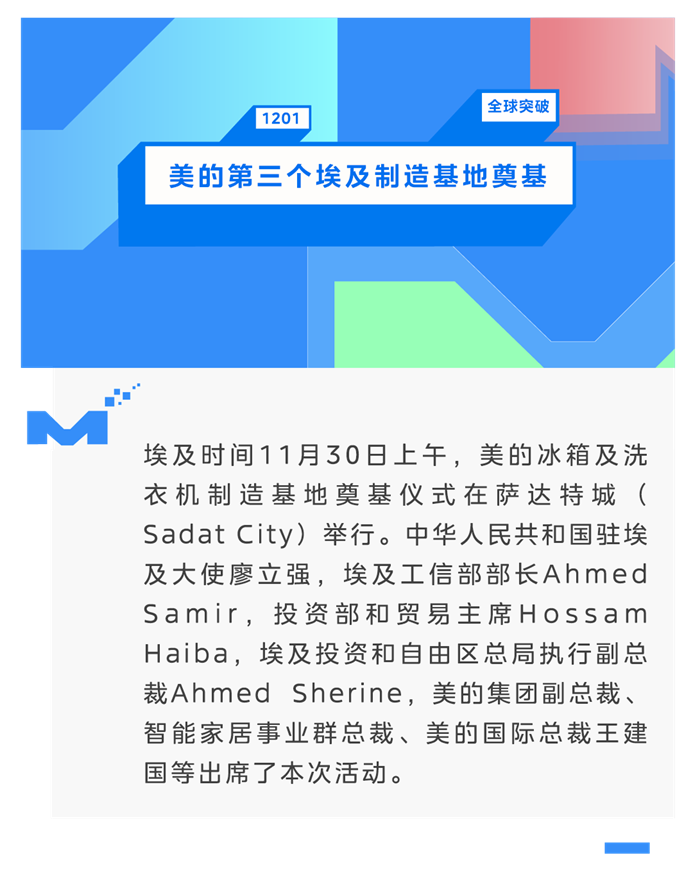 據(jù)悉,美的埃及冰箱及洗衣機新基地占地面積22.2 萬平方米,總投資額8.3億人民幣,預(yù)計將于2025年下半年正式投產(chǎn)運營,這也是美的在埃及布局的第三個制造基地。