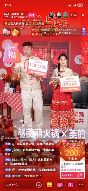 為激發用戶參與感,拉近用戶與品牌的親密度,雙方還聯合推出團購套餐上線抖音120家門店直播間和60位達人直播間,吸引大批粉絲涌入直播間搶團購福利,同時雙方通過營造冬季吃火鍋的溫暖氛圍感,以情景式代入感,積極與網友進行話題互動,并詳細介紹雙方聯名火鍋特色亮點和美的廚熱多元產品,激發更多目標消費者興趣到線下打卡體驗。