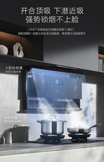 除了外觀設計,煙機的凈煙效果也不容忽視。傳統超薄煙機往往采用單開合或單升降結構,烹飪時易跑煙。而美的超薄無煙感煙機搭載四維立體無煙感科技,采用德系腕表同源設計,精細調配連桿及齒輪契合度,實現上開合和下平降精準同頻聯控,下潛近吸雙腔進風口更近煙源點能夠實現快速勁吸,同時配合頂吸雙腔同步開啟,形成60°黃金角度攏煙,有效攔截余煙,確保油煙無逃逸。同時,它還配備智聯巡航技術,實現“自動擋”吸排油煙,通過領先的射頻技術,灶具點火,煙機會自動開啟,并采用AI數算法,自動感知公共煙道阻力,自動調整風量風壓暢快排煙,即便廚房小白也不怕手忙腳亂。