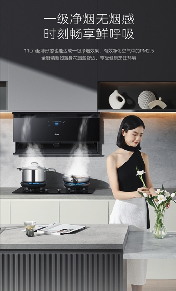 作為家電行業龍頭,美的深挖用戶痛點,創新研發帶來超薄無煙感煙機,重構“平板薄”一體化新形態,其整體厚度僅為11cm,機身上下同薄,純平貼壁,待機狀態下,如同壁畫般輕松融入各式廚房風格,百搭不挑柜。該創新設計,不僅有效節省廚房空間,而且讓廚房變得更整潔美觀。